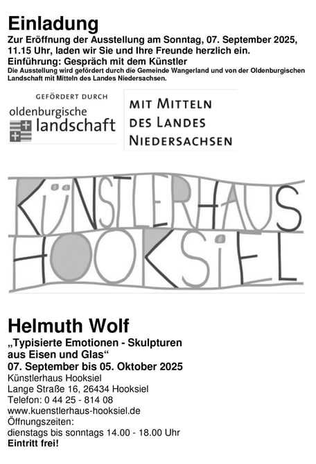 Im beschaulich schönen Hooksiel im Wangerland zeige ich einen Teil meiner neuen Arbeiten aus 2024 und 2025 unter dem Titel „Typisierte Emotionen - Skulpturen aus Eisen und Glas".