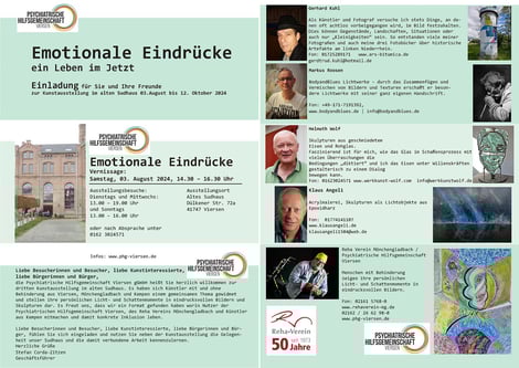 Die Psychiatrischen Hilfsgemeinschaft Viersen, des Reha Vereins Mönchengladbach und wir Künstler würden uns über einen Besuch freuen.