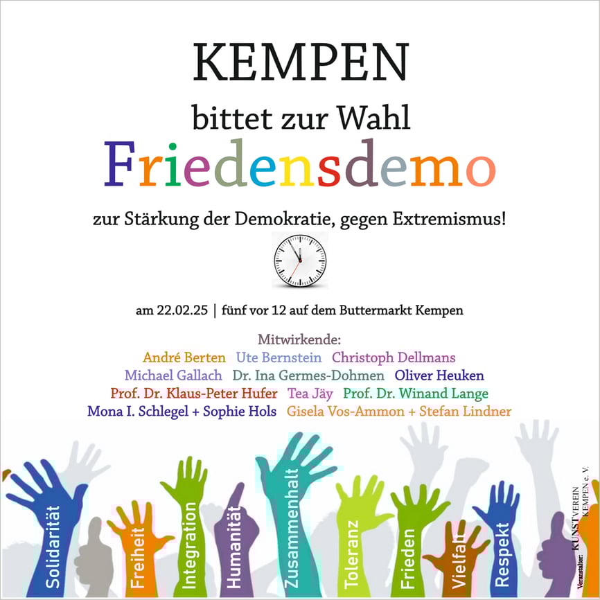 Wir treffen uns am 11. Mai um 16 Uhr am Buttermarkt und freuen uns auf DICH und EUCH. Steht auf für ein buntes Kempen f zur Stärkung der Demokratie ohne Extremisten.